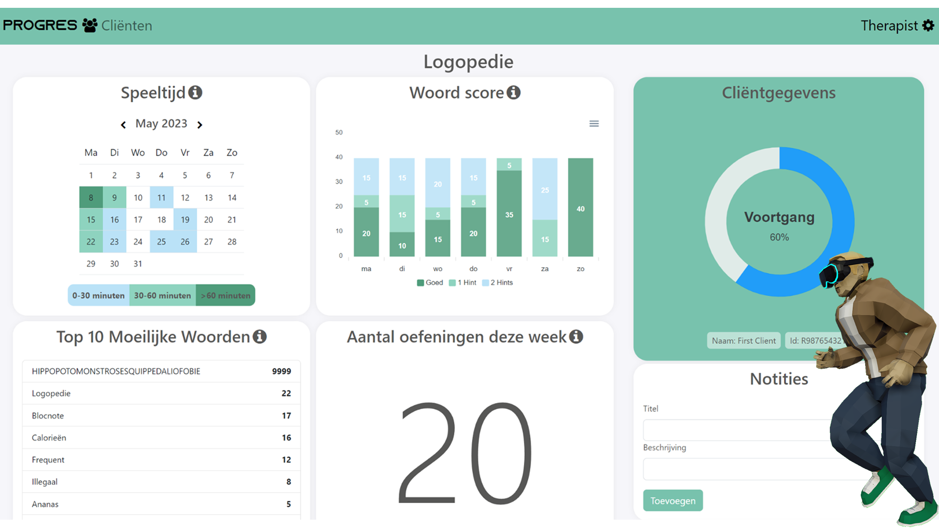 Door te werken aan een virtueel revalidatiecentrum, kunnen wij de patiënt plaats en tijd onafhankelijk laten revalideren. Binnen het virtuele revalidatiecentrum kan de therapeut op afstand monitoren en kunnen zij beiden de progressie inzien van de VR modules. Het virtuele revalidatiecentrum zorgt voor afleiding, stimuleren van prikkels, situaties die naar je toe komen en vooral het revalideren nog leuker maken.